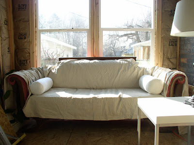 Remember "Rosie" , the rose-colored velvet settee I found a few month's back and wrote about in the "Settee in Waiting" post? Rosie has been called into service without proper uniform. The estimate for recovering the settee is way beyond the wildest extravagances of my current budget and I'm not inclined at this time to take on this upholstery task myself. My idea was to have the sofa covered in cotton painter's drop cloth fabric because I love the color and texture and the mix of that functional industrial aesthetic with the sofa's formal character. I have hauled Rosie from the garage into the (unfinished) backroom and she fits in her place, just as I had planned. For the time being, she's draped with a painter's drop cloth. I already had a couple of down-filled bolster pillows for which I will make covers from a coordinating fabric that I also already had on hand. She's a comfy gal, that Rosie---I attempted a Sunday nap on her last weekend with great success! It's easy to rationalize any decision, and I decided for now while I have housemates who may not be as careful about spills as I try to be, a draped drop cloth is practical for easy cleaning, too!