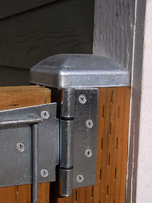 Above:  Hinge side of the fence where the post attaches to the corner of the garage.  I found the galvanized post caps online at Bevo Works here.  The horse fencing was located at an agricultural suppler.  All other materials can be found at Home Depot or Lowe's.