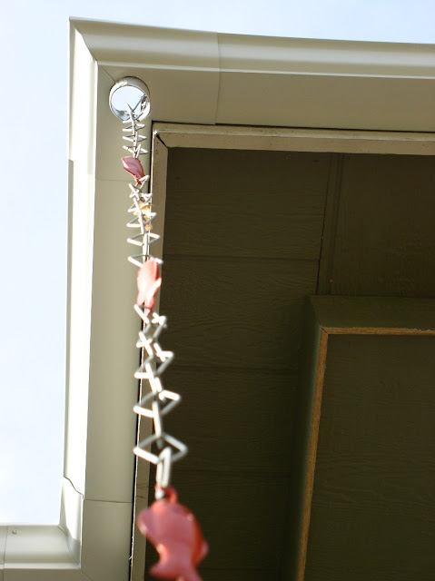 Above:  Goldfish rain chain.  I decided to use a rain chain instead of a downspout, as the junction of the roof overhang and the main body of the house created an awkward condition in which a huge and unattractive down spout elbow was required.