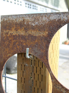 Above:  The rusted steel panel was hung on two L-hooks which were screwed into the posts.  This allows the panel to be lifted off  for service access.