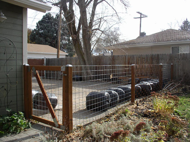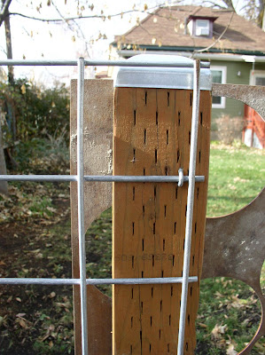 Above:  Here's the design I came up with, which was functional, budget friendly and pretty easy to build.  I purchased a rusted steel panel from a local salvage yard which is interesting to look at, in itself.  The panel is the "waste" that was left over after circles were punched out for the original purpose.  It is five feet tall (the perfect height for the fence I wanted) and ten feet long.  The method I used to install the steel panel allows easy removal for service access.  (Oh, yes, those big round black bundles are eighteen bags of leaves I raked over the last couple of weekends.  My neighbors who have created a full-city lot size garden and orchard will be able to use most of the leaves for mulching/compost!)