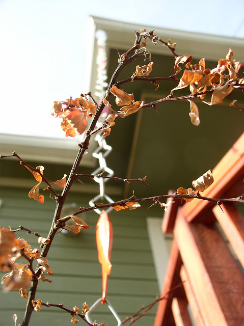 Above:  ...and up to the corner opening in the gutter.  I needed eleven and a half feet of chain for this location.  There are some beautiful copper rain chains on the market.   I had very little budget for a rain chain and located this "budget" chain via Amazon.com where there was one six-foot length in stock, and via Target.com where there was another six-foot length in stock---together giving me twelve feet.  So I ordered from the two different sources to get enough.  This chain is no longer in stock at these two places---I must have bought the last!  I don't know any other place to find it.  Hope it lasts a good little while!