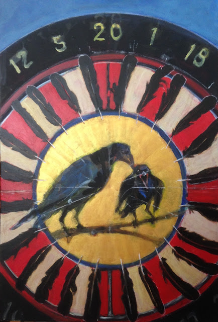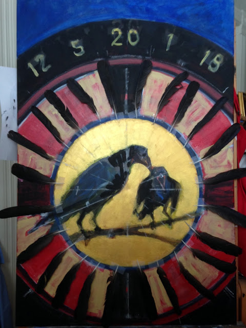 And this week I am re-designing it again---inspired by crow feathers I collected when I lived in Seattle and first began painting crows. The following photos show the real feathers taped to the painting. Though I love the idea and appearance of the real feathers attached (in a secure manner) to the canvas, I know it is impractical, making the work vulnerable. It would need to be protected from dust and bumping by being mounted under glass or plexiglass. That's not the direction I want to go.