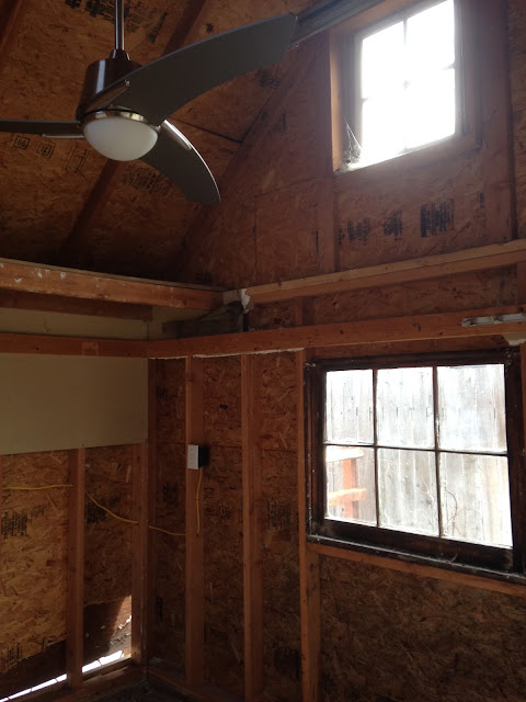 I've decided to call this building the S.O.B. (Studio Out Back).  This is the inside.  There's work to do repairing damage that occurred during the move---nothing too serious replacing a sill plate and some of the wall sheathing that we had to saw through to attach tow straps to the structure.  All the electrical wiring and devices are installed, including the new ceiling fan you see in the photos.  I'm looking forward to being able to move my studio furniture inside and use it---it's a great little space!