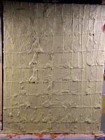 Prior to starting to explore encaustic painting techniques, I have been using melted wax as a frisket for layering acrylic paint in some of my work. Melted wax does not mix well with acrylic paint. Oil paint and/or dry pigment are compatible to use for coloring the wax in encaustic painting. The use of melted wax in my acrylic paintings has been purely as a frisket or masking device as I add subsequent layers of acrylic paint. When I am ready, I peel away the hardened wax to reveal the image I'm after. The photo on the left illustrates the point in the painting process in which the last layer of acrylic paint has dried and I am about to remove all layers of hardened wax to reveal desired arrangement of layers of color in the final painting.